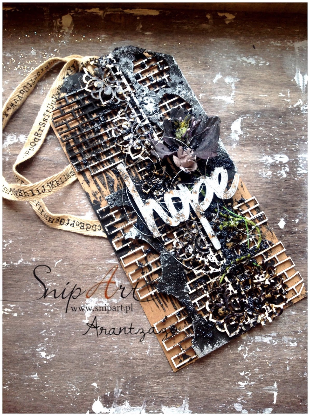 Po przez wykorzystanie czerni starałam się nadać mojej pracy głębie stosując również cienie i tekstury! Użyłam odrobinę szarego i złotych muśnięć, aby nadać wyjątkowy charakter tagowi.