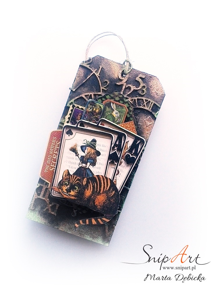 Today I'd like to show you my tag inspired by the newest collection "Lucky Games" . For today I chose cards and I mixed them with a lovely clock background and nice papers from old Graphic45 collection. It has cards too and it appeared that they match perfectly to the chipboard.